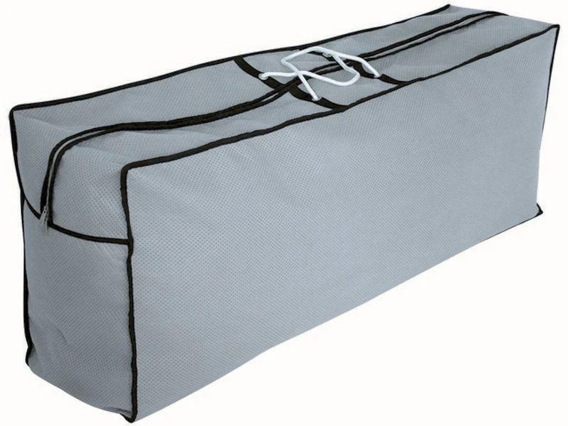 Een hoes voor tuinmeubelkussens in de vorm van een draagzak, zodat je de kussens eenvoudig kunt verplaatsen.