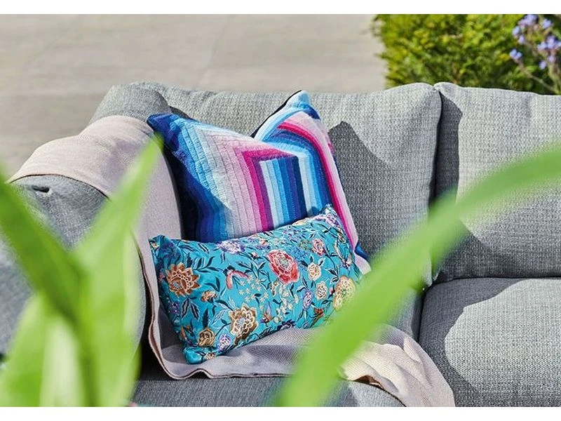 Het gebruik van sterke, duurzame en weerbestendige materialen maken deze loungeset bijzonder onderhoudsvriendelijk. Het aluminium frame is uitgevoerd in matt royal grey en geeft de set een industriële uitstraling. De verstelbare tafelbladen zijn van gecertificeerd teak: een sterke houtsoort die door een natuurlijk proces verkleurt tot een warm grijs. De kussens zijn waterafstotend en gemakkelijk schoon te maken.